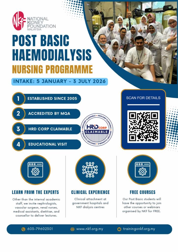 Our Training Centre has been conducting the Post Basic Haemodialysis Nursing (PBHDN) Programme since 2005 and has attained the Malaysian Qualifications Agency (MQA) Accreditation since 2017 for this programme. The PBHDN programme provides structured training in the renal specialty for the dialysis nurses as haemodialysis requires specialised nursing care. This 6-month programme aims to equip nurses with the knowledge and competencies to respond effectively to the demands of the kidney failure patients.