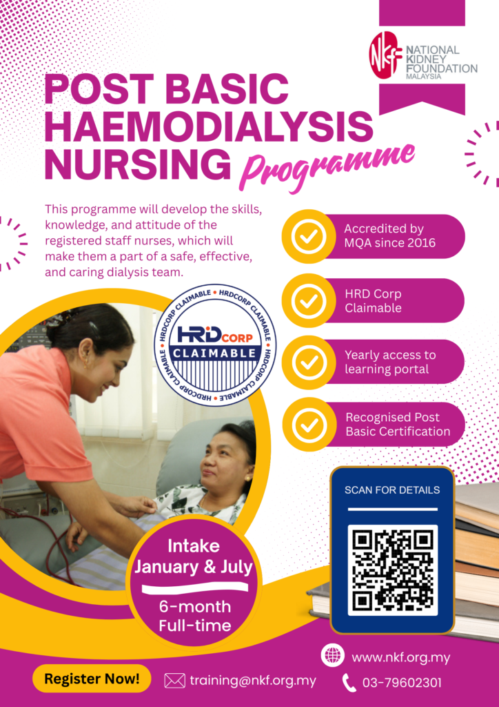 Our Training Centre has been conducting the Post Basic Haemodialysis Nursing (PBHDN) Programme since 2005 and has attained the Malaysian Qualifications Agency (MQA) Accreditation since 2017 for this programme. The PBHDN programme provides structured training in the renal specialty for the dialysis nurses as haemodialysis requires specialised nursing care. This 6-month programme aims to equip nurses with the knowledge and competencies to respond effectively to the demands of the kidney failure patients.